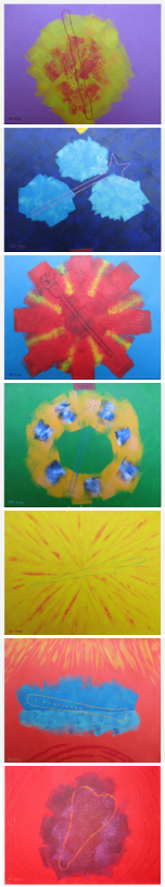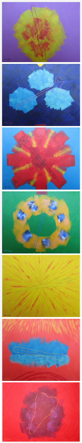 Archekra 7: bedelaarsstaf Acryl op katoen 30 x 40 cm (verkocht) Archekra 6: toverstaf Acryl op katoen 30 x 40 cm (verkocht) Archekra 5: narrenstaf Acryl op katoen 30 x 40 cm (verkocht) Archekra 4: scepter Acryl op katoen 30 x 40 cm (verkocht) Archekra 3: lans Acryl op katoen 30 x 40 cm (verkocht) Archekra 2: fluit Acryl op katoen 30 x 40 cm (verkocht) Archekra 1: knots Acryl op katoen 30 x 40 cm (verkocht)
